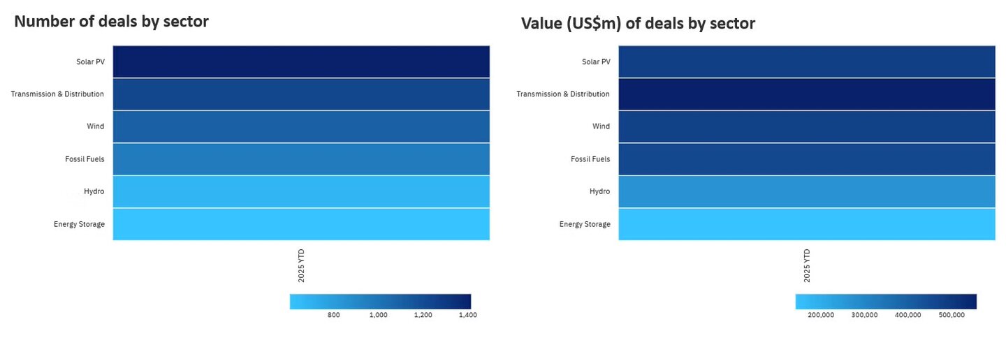 In terms of sector, solar PV deals came out on top with 1,412 transactions totalling roughly $480.2bn. However, the largest share of capital ($557.3bn) flowed into T&D, which saw fewer deals (1,223), reflecting the large-scale and capital-intensive nature of T&D projects, as well as the vitalised global focus on upgrading grid infrastructure.