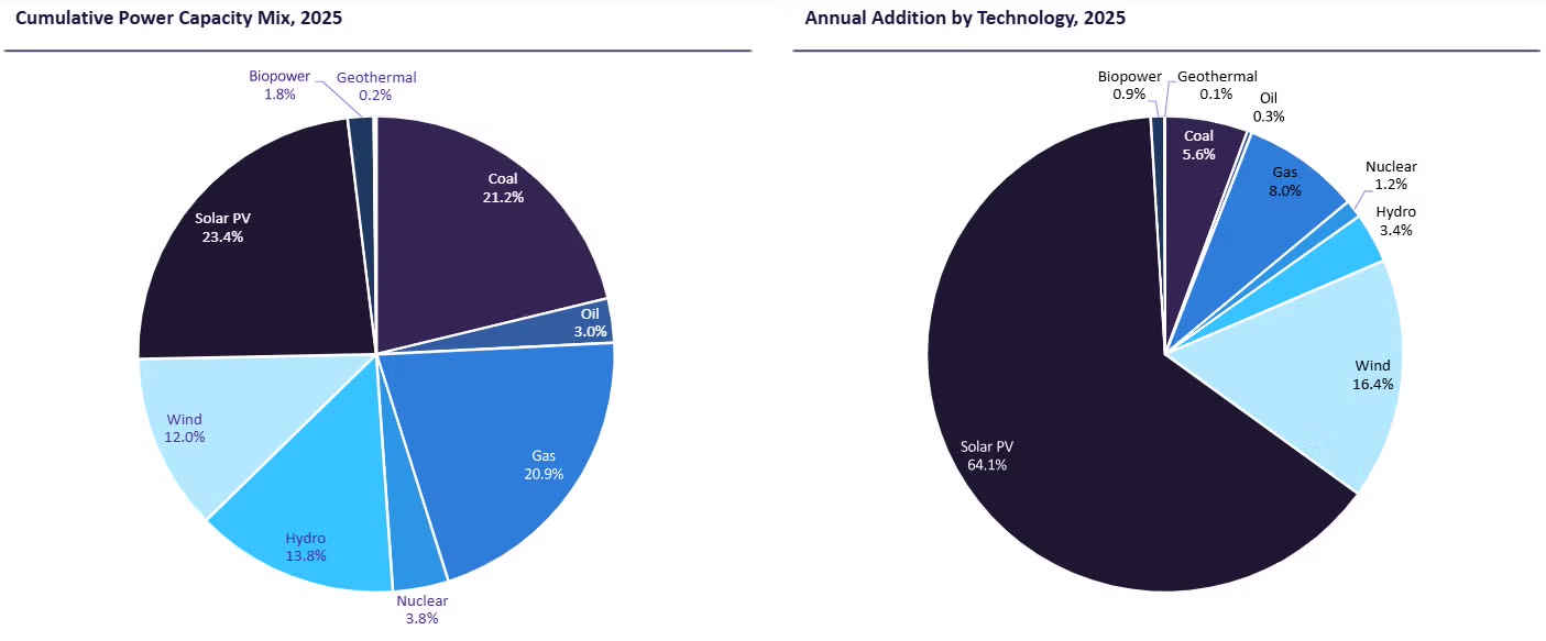 Renewables accounted for nearly half of the cumulative capacity mix this year. Annual capacity additions appeared even more skewed, with 64.1% coming from solar photovoltaic (PV) alone and wind contributing another 16.4% – together, making up a staggering 80%.