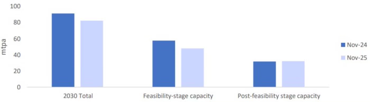 The drop is even starker when the analysis is extended to 2035, with expected capacity to come online falling 28% and 26% year on year (YoY) for high and low-case scenarios, respectively. Reflecting the revisions in project scale and timelines announced this year, forecasted average capacity from projects starting between 2031 and 2035 declined from 1.35 million tonnes per annum (tpa) to 300,000tpa.