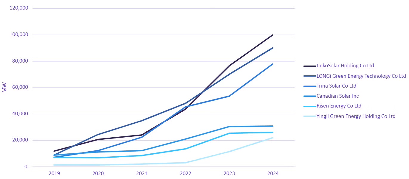 Solar module production from key original equipment manufacturers between 2019 and 2024 (MW). Source: GlobalData.
