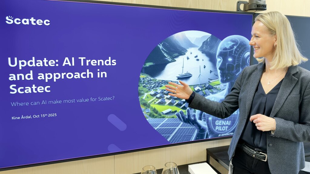 Kine Årdal giving a presentation in Scatec’s office. Credit: Kine Årdal, 2025